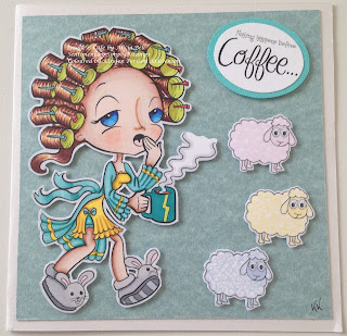 Well, I'm going to show you a card I loved making - Gosh, I can see it's already 1½ years old - but I'm sure it's not been shown before. It's an image called "Cafe" from the very talented Alicia Bel and it illustrates me in the morning before coffee except my curls are real and I don't have those cute slippers LOL.